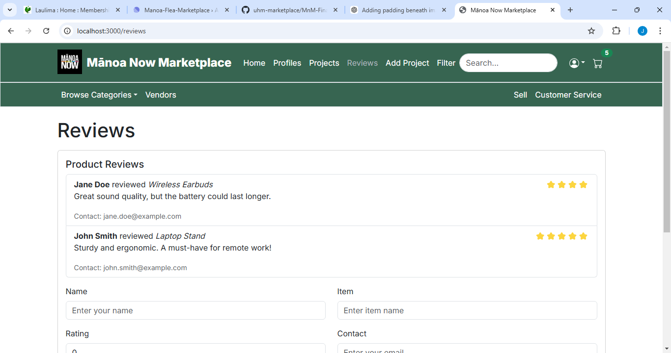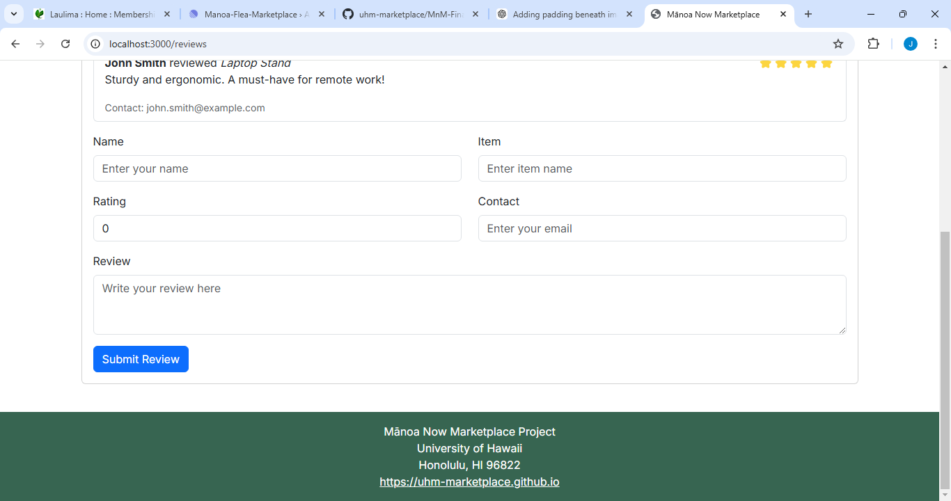 Design patterns are reusable solutions to common problems that are often encountered in software engineering. These patterns provide a structured approach to solving recurring challenges and promotes a code that is more maintainable, scalable, and efficient. Creational Patterns, Structural Patterns, and Behavioral Patterns are all examples of types of patterns for Object Oriented Design. Some of the most common design patterns are Singleton, Factory Method, Observer, and MVC. MVC (Model-View-Controller) is an example of a design pattern that was used in our final project: UHM Marketplace. The review page is an example of how user inputs are taken and processed through a database and displayed back out onto the user interface for users to view.