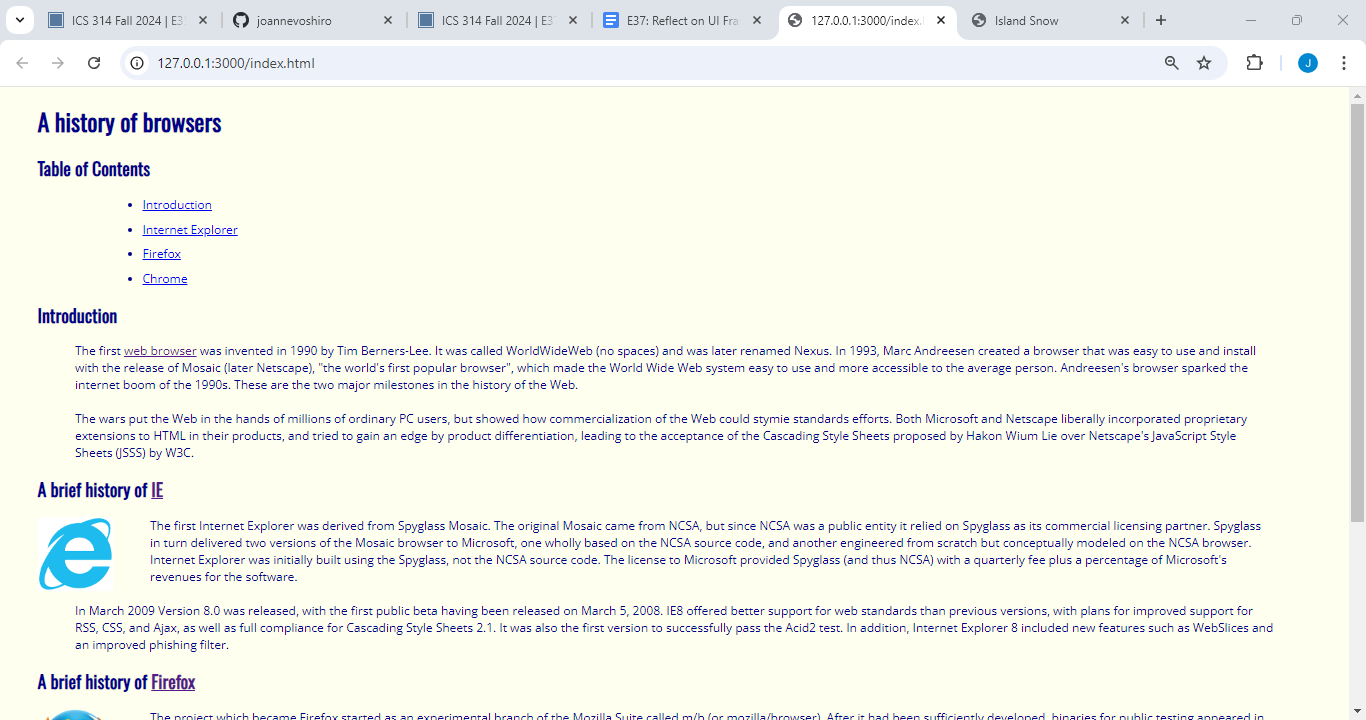 During the “E30: BrowserHistory1” exercise, we were instructed to create an index.html file that contained different components that would structure the document into four subsections. We were also given instructions to prove that we’d be able to do things such as link external web pages within the text, create an itemized list for the table of contents, the internal links that led to each section, and insert photos within each subsection. All of which was made using raw HTML rather than relying on Bootstrap 5.